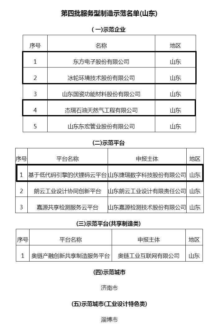 5家示范企业分别为东方电子股份有限公司、冰轮环境技术股份有限公司、山东国瓷功能材料股份有限公司、杰瑞石油天然气工程有限公司、山东东宏管业股份有限公司。4个平台是基于低代码引擎的伏锂码云平台、朗云工业设计协同创新平台、嘉源共享检测服务云平台以及奥链产融创新共享制造服务平台。同时,济南市和淄博市分别入围示范城市公示名单和工业设计特色类示范城市公示名单。