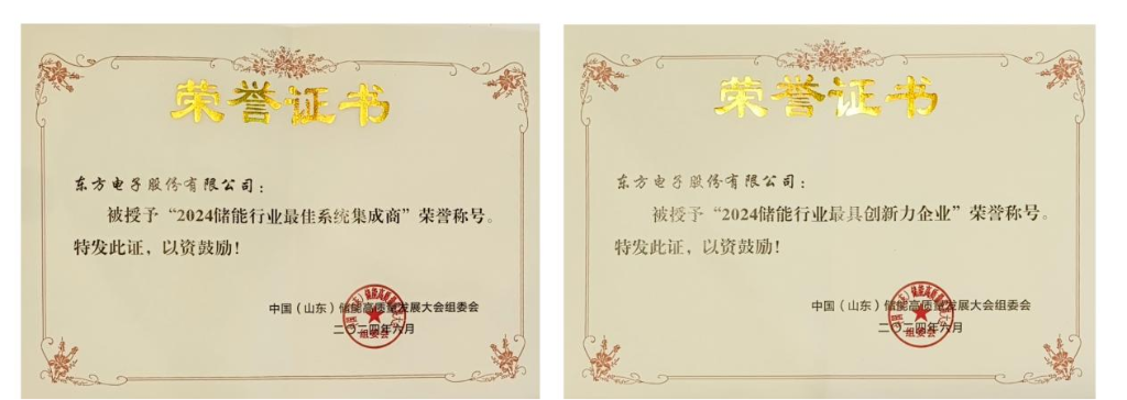▲东方电子被中国(山东)储能高质量发展大会组委会授予“2024储能行业最佳系统集成商”、“2024储能行业最具创新力企业”