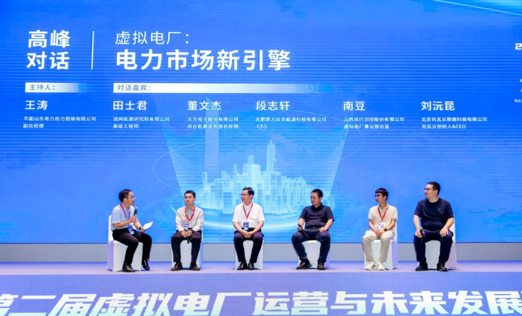 大会还进行了“虚拟电厂:电力市场新引擎”高峰对话,华能山东电力热力营销有限公司副总经理王涛主持对话,国网能源研究院有限公司高级工程师田士君、东方电子股份有限公司综合能源业务部总经理董文杰、合肥原力众合能源科技有限公司CTO段志轩、山西风行测控股份有限公司虚拟电厂事业部总监南豆、北京兆瓦云数据科技有限公司兆瓦云创始人&CEO刘沅昆深入探讨了虚拟电厂的发展现状与前景,以及可行性的商业模式。