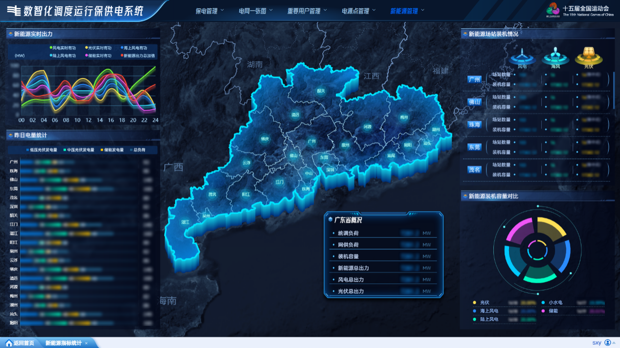 东方电子为广东电网量身打造的数智化调度运行保供电系统,实现了从能源源头到场馆终端的全链条可视化监控。系统动态追踪西电东送线路、海上风电、分布式光伏等绿色能源的分布与流向,让每一度绿电都可追溯、可管控。赛事期间,系统成功锁定绿电6.6亿千瓦时,打通碳排放核查与绿色金融全流程,以实际行动践行绿色低碳办赛理念。