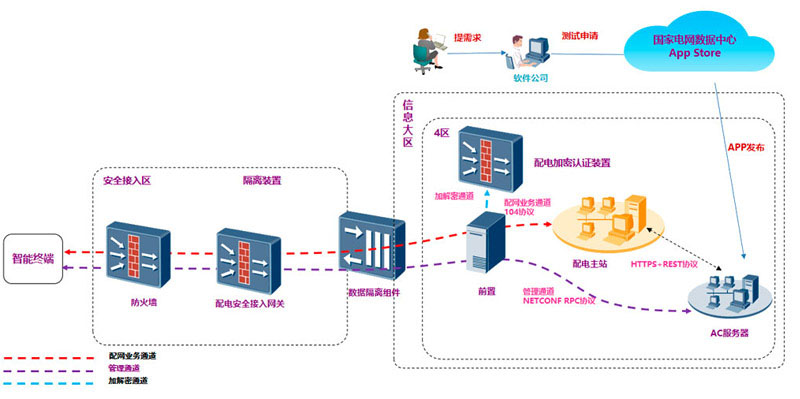融合IT与OT技术,构建主站与智能配电终端的“云端协同”体系,实现“云管边端”贯通。支持智能配电终端设备的操作系统管理、运行日志查询,实现对智能配电终端设备的容器安装、卸载、启动、停止操作。建立电力APP用商店,实现对智能配电终端设备的应用软件安装、卸载、启动、停止操作,可支持应用软件列表、版本、运行状态等信息査询。