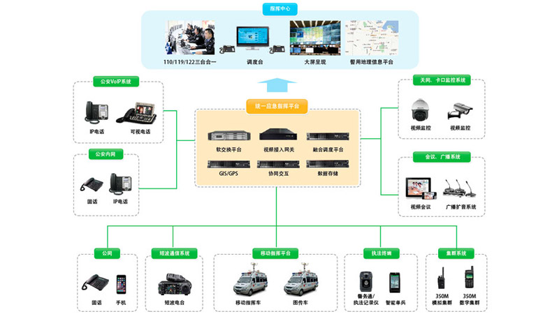 近年来,公安部门逐步建立了以指挥中心为龙头,各警种为骨干的快速反应体系,初步实现了对各类案件的指挥调度、快速出警。但随着社会总体治安形势的不断变化,指挥系统的信息化应用水平整体不统一,日益成为制约公安部门应急处突工作的主要问题。eWise8000统一指挥通信系统平台响应公安部扁平化指挥体系建设的相关要求,建立“信息化主导、扁平化指挥、一键式调度、智能化处置”的新型指挥调度体系,全面提升公安部门扁平指挥、精确处置、综合作战的水平,完成指挥资源管理、警情汇总、警情研判、预警分析、预案管理、调度指令流转、警力调配、处置结果反馈等相关业务工作。