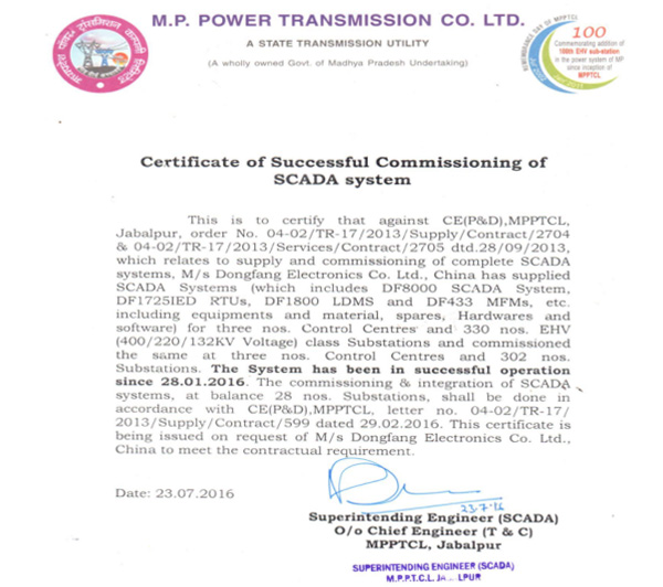 In 2016, Dongfang Electronics finished the transfer of SCADA of MP transmission project in Madhya Pradesh, India. This is the first province-level SCADA power transmission project in India. Till now, it is still the only province-level power dispatch automation project in India.