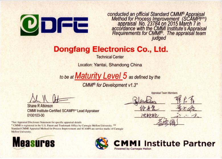 This model is divided into five levels. Dongfang Electronics Co., Ltd passed CMMI Level 3 Assessment the first time in 2008, and passed CMMI Level 3 Re-assessment in 2011. On March 7th 2015, DFE passed CMMI Level 5, the highest level for software maturity, which means that R&D and products of Dongfang Electronics Co., Ltd have the ability for quantization-based prediction, analysis, control and continuous improvement.