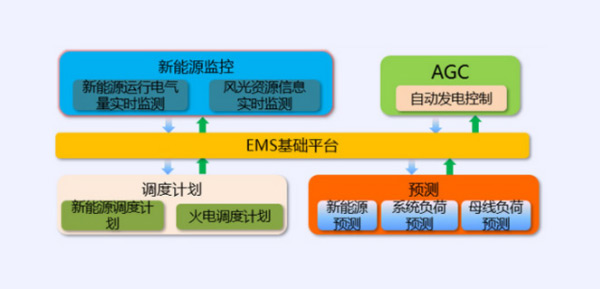 新能源监控系统集成新能源监控、新能源功率预测、自动发电控制AGC、自动电压控制AVC和传统EMS等多功能于一体,实现新能源和传统能源并网控制和协调运行。