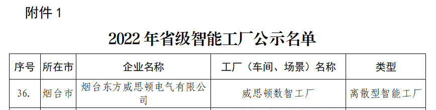 日前,山东省工信厅对2022年山东省智能工厂名单进行了公示,东方电子旗下威思顿电气的“威思顿数智工厂”成功入选。