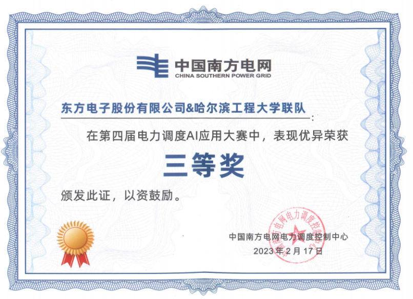 东方电子荣获第四届南网电力调度AI应用大赛三等奖