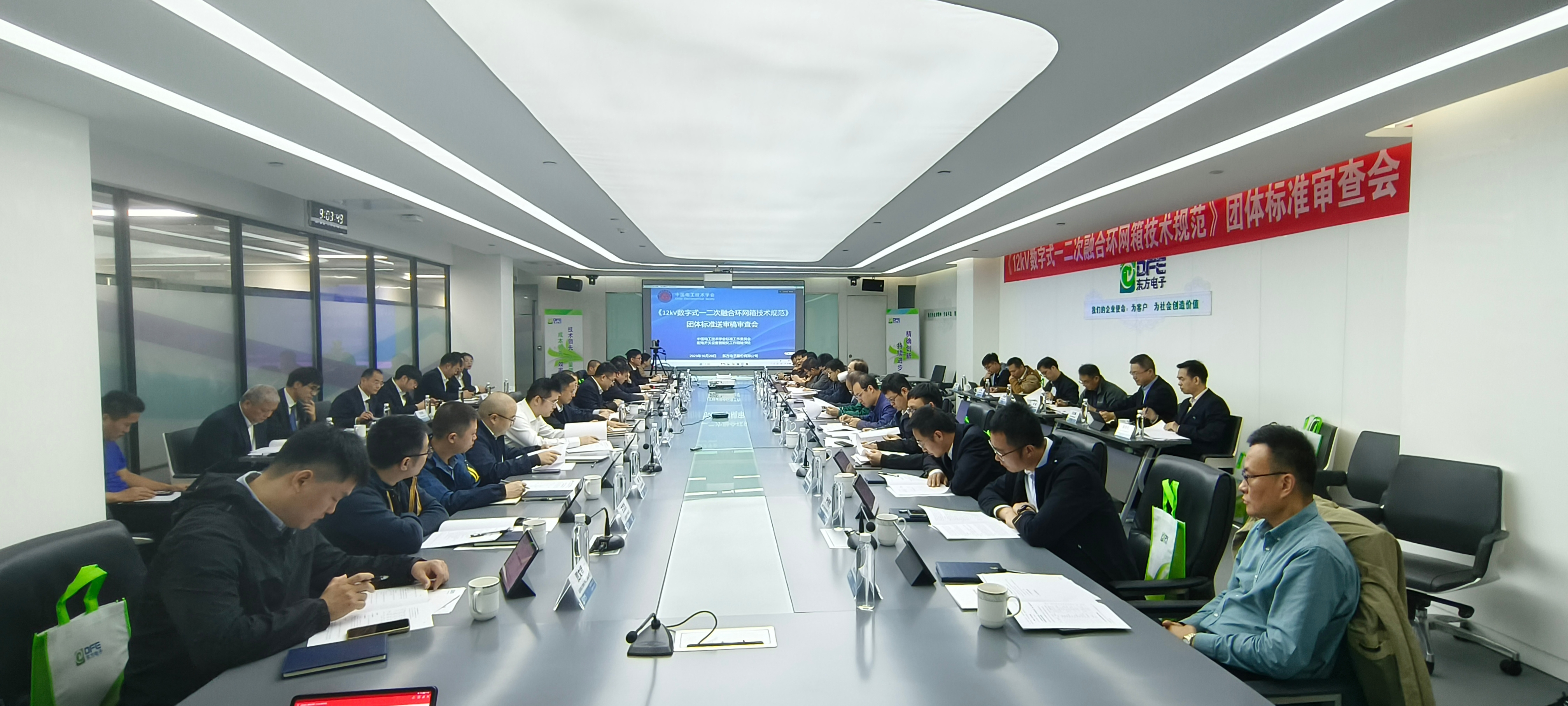会议由中国电工技术学会配电开关设备智能化标工组秘书长沈兵兵主持。东方电子股份有限公司智能配电事业部总工程师王高海代表主要起草单位向专家组进行编写情况汇报。与会专家对《12kV数字式一二次融合环网箱技术规范》团体标准的专用术语、技术要求、设计与结构以及试验检测等方面进行了专业、细致的讨论交流。最后由评审专家投票表决,全票通过了《12kV数字式一二次融合环网箱技术规范》送审稿审查。
