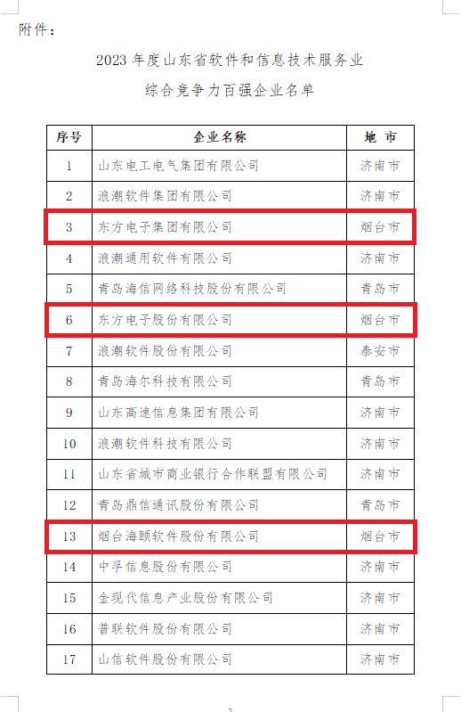 1月17日,山东省软件行业协会公布“2023年度山东省软件和信息技术服务业综合竞争力百强企业名单”,经企业申报、材料初审、专家评审和网上公示,东方电子集团有限公司入选2023山东软件企业百强第3名、东方电子股份有限公司入选山东软件企业百强第6名、烟台海颐软件股份有限公司入选山东软件企业百强第13名。