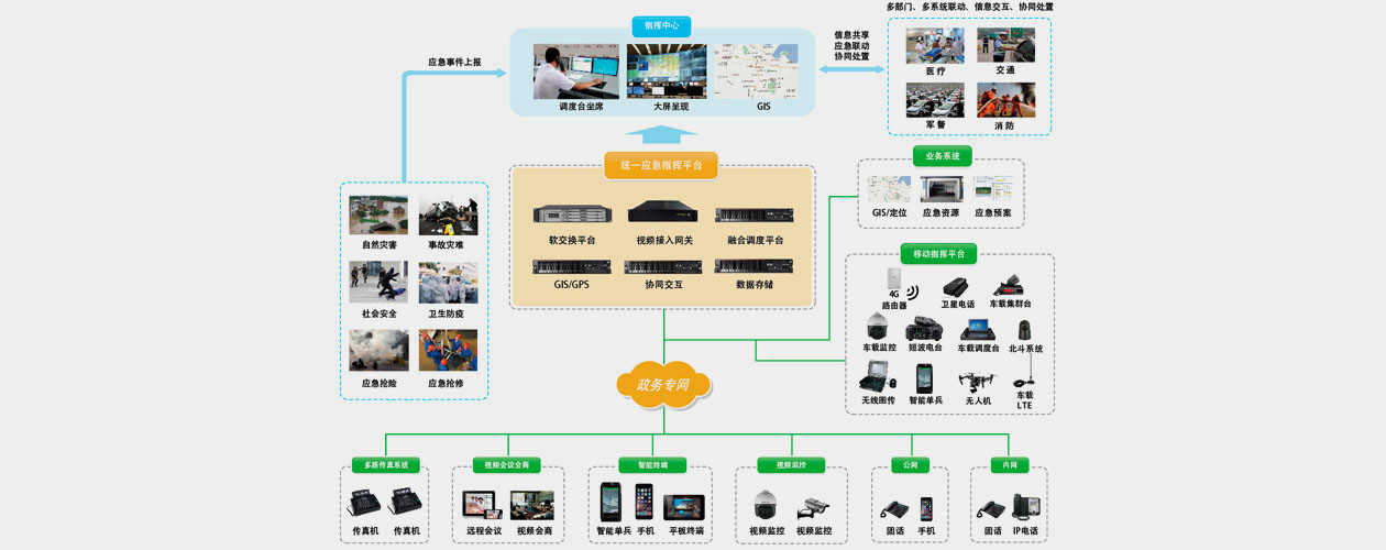 目前,公共安全事件及群体性事件时有发生,应对城市突发公共事件已成为政府部门一项非常具有挑战性的工作。如何高效利用有限的资源,提高政府部门对紧急事件快速反应和抵御风险的能力,并为人民群众提供更快捷的紧急救助服务,成为政府职能部门的主要工作内容之一。政府综合应急指挥调度系统旨在帮助政府相关工作部门轻松完成大范围、不同人员统一通信指挥,实现全员协同通信、实时可视指挥、资源GIS管控调度和图形化任务交互,具备同时处理多起突发事件的能力,提高对应急事件的能力和应急处置效率。